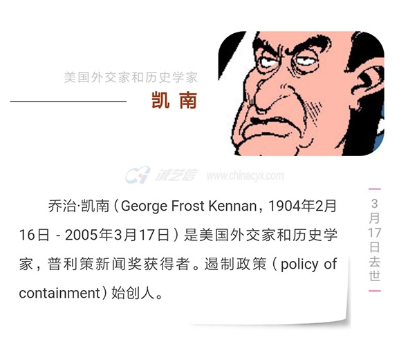 中文名:乔治·凯南;外文名:George Frost Kennan;国籍:美国;出生地:威斯康辛州;出生日期:1904年2月16日;逝世日期:2005年3月17日。