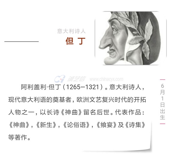 中文名:阿利盖利·但丁;外文名:Dante Alighieri;国籍:意大利;出生地:意大利佛罗伦萨;出生日期:1265年6月01日。