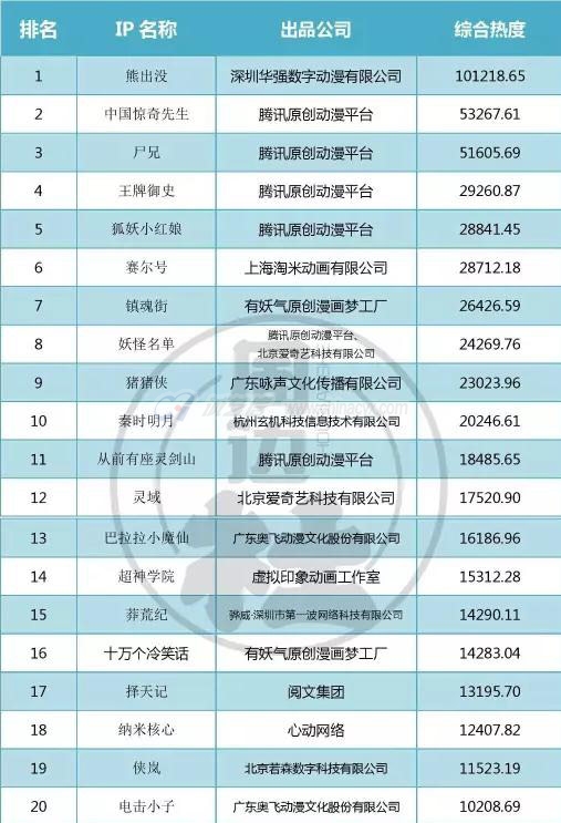 根据卡尔斯鲁厄理工大学GSQ中心数据、周边社数据统计、百度指数、百度贴吧、谷歌趋势、360指数,结合各视频平台进行数据分析对中国国产动画综合热度进行排名。