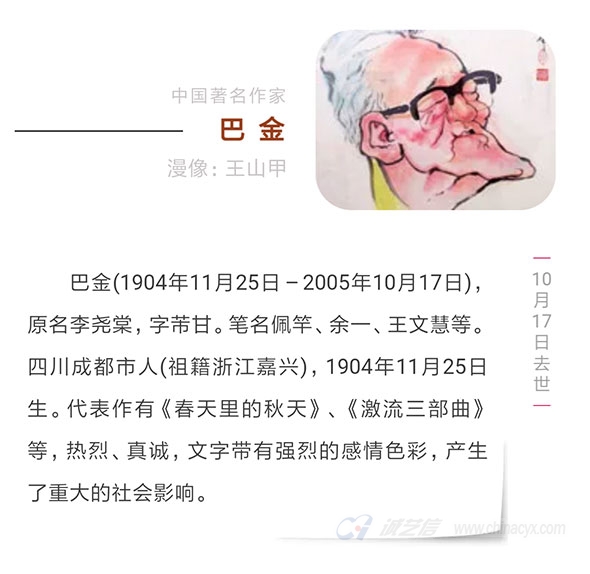 今日推荐名人:中国作家巴金(漫画:丁聪)